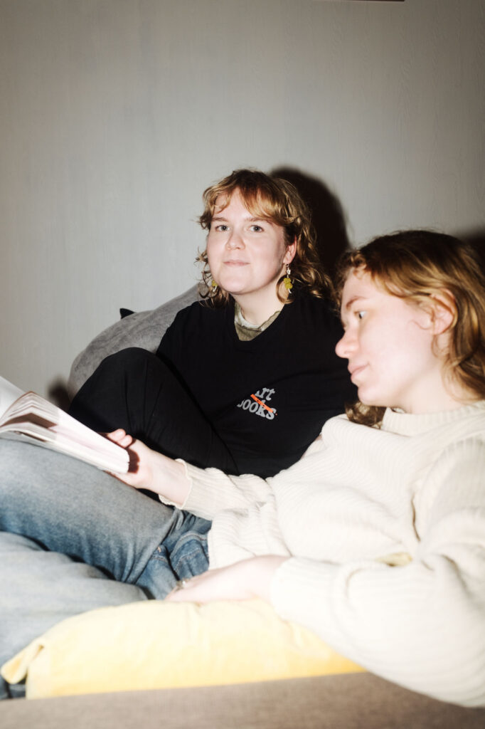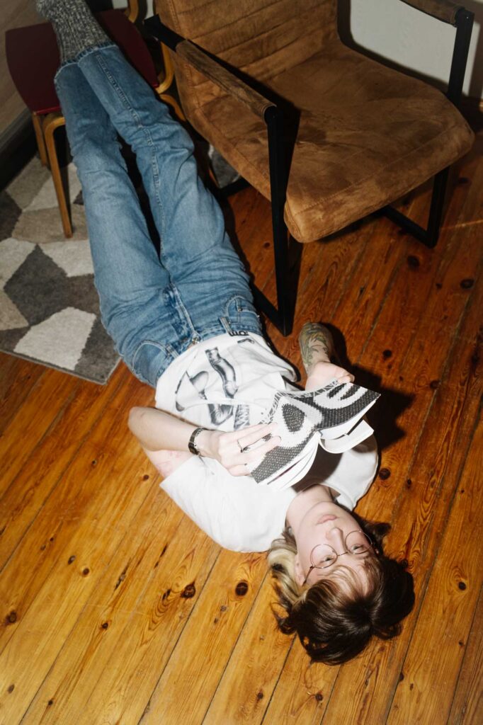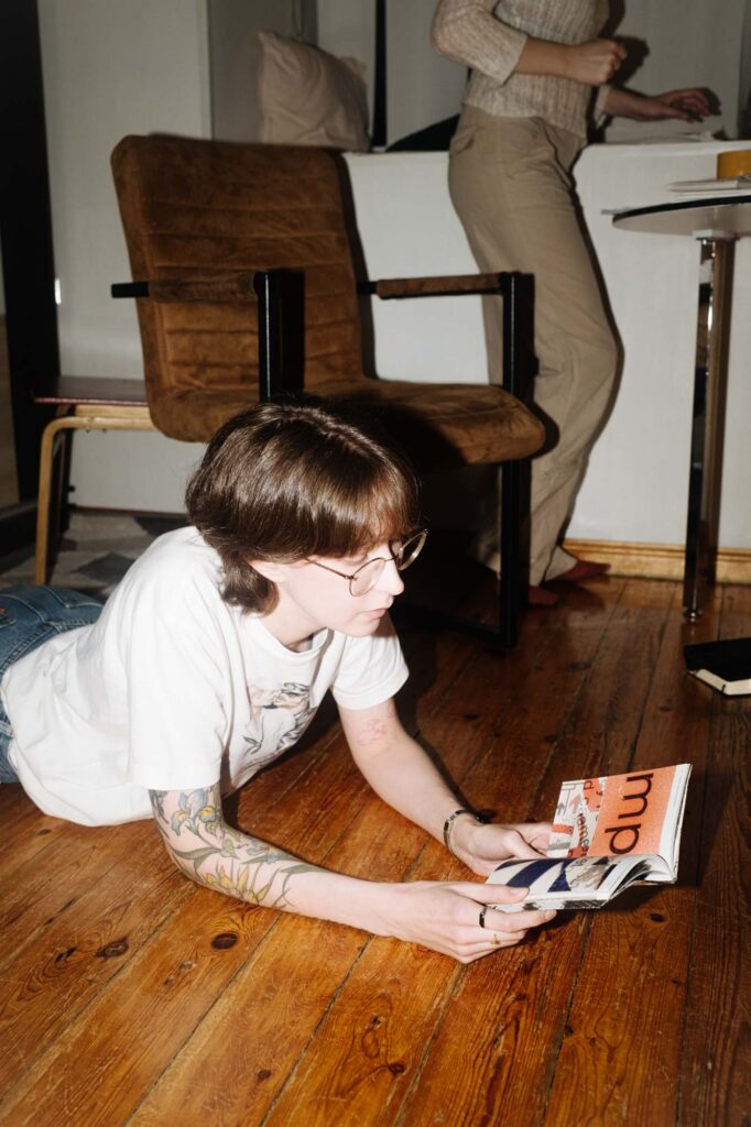 Heneliis: Ei no see on päris kohutav, jah. Kui keegi mulle seda ütleks – et „kirjuta nagu sina ise“ –, siis ma vist tahaks ära minna… Mulle väga-väga meeldib Maria kväärperspektiiv ja ma tunnen tema visuaalides nii palju tuttavat ära. Ma olen veetnud väga palju aega Maria Instagramis scroll’ides. Tema töödes on nii palju detaile ja kihte, millega ma eri viisidel suhestun. Maria teeb visuaaliga seda, mida mina tahaksin tekstiga teha. Mul on tunne, et meie töös on midagi sarnast. Kui me esimest korda kokku saime, võttis ta kaasa märkmiku, mis oli igasuguseid asju täis kleebitud.